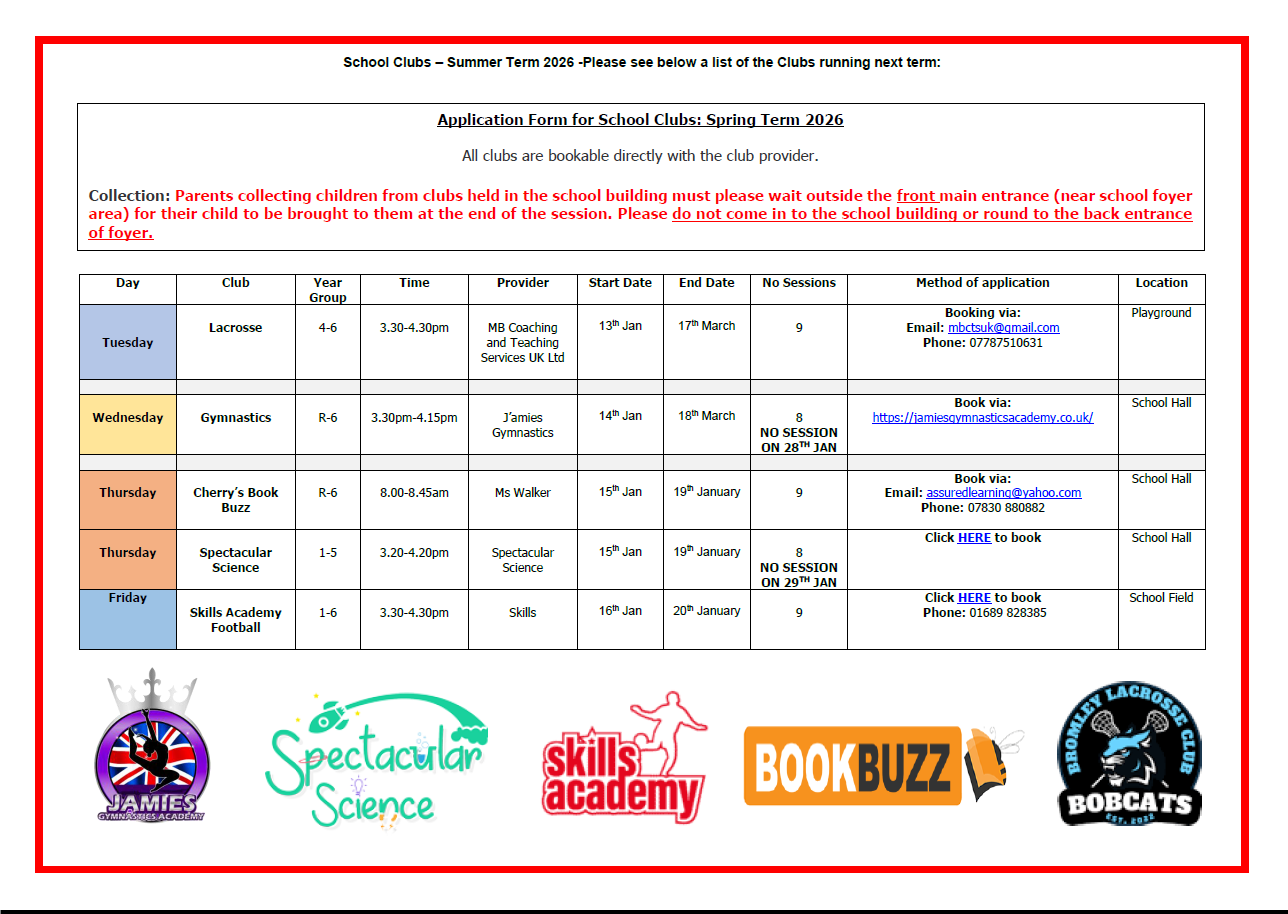 At the end of each term we will send home a Clubs schedule for the following term, detailing what will be running and how to apply.