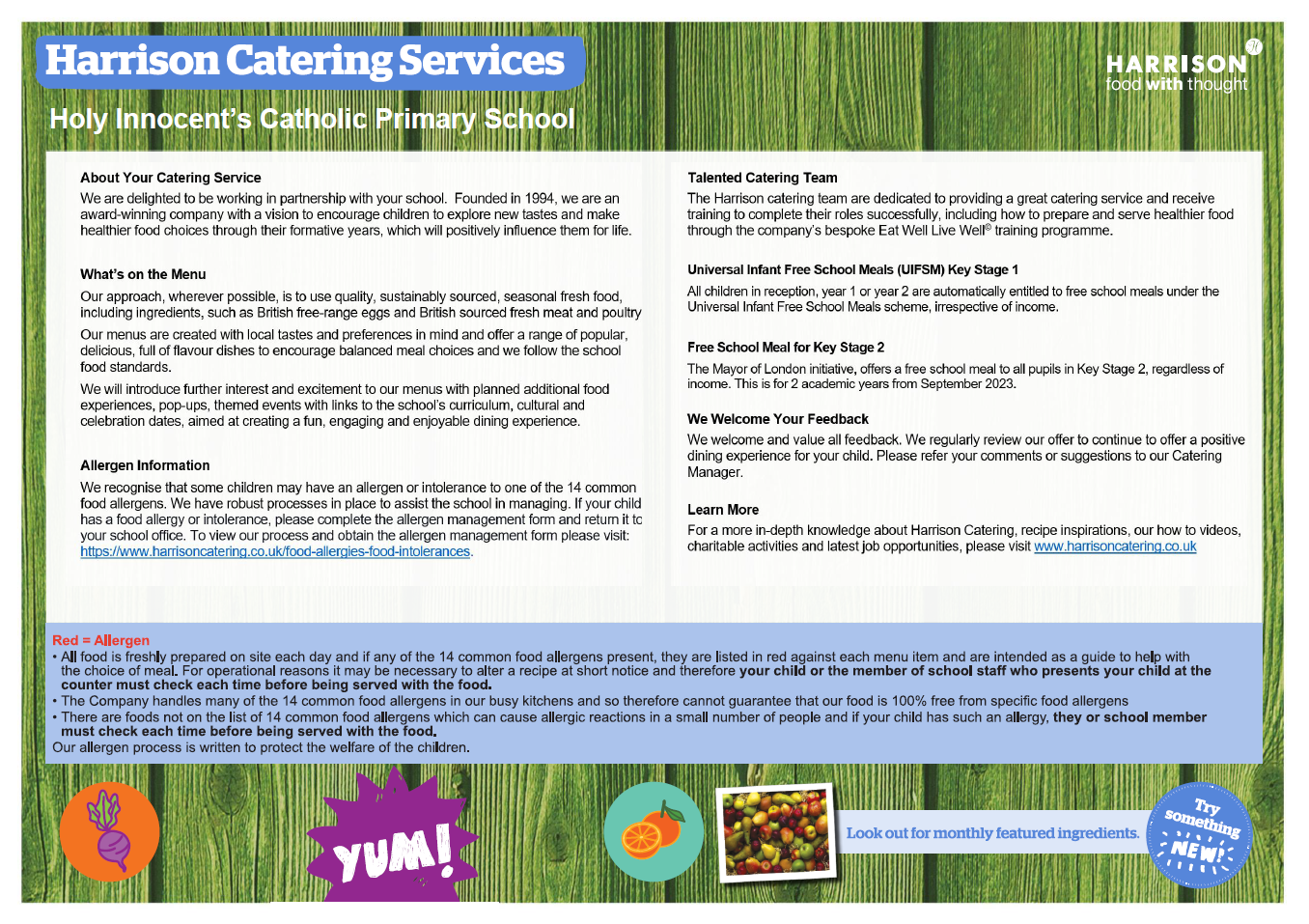 Our delicious and nutritious school meals are supplied by Harrison Catering. The menu rotates every three weeks and the children really enjoy tucking in to their lunch each day when a selection of homemade dishes are on offer, one of which is vegetarian. If your child has a particular diet requirement then don't worry, our school cook is used to catering for specific needs.